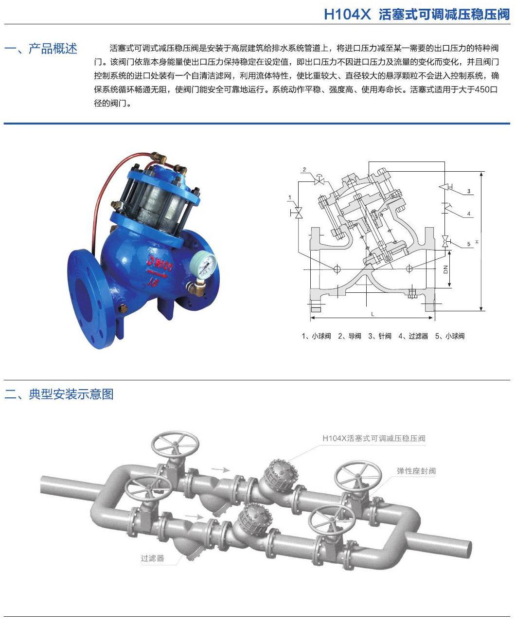 - 活塞式可調(diào)式減壓穩(wěn)壓閥是安裝于高層建筑給排水系統(tǒng)管道上,將進口壓力減至某一需要的出口壓力的特種閥門。