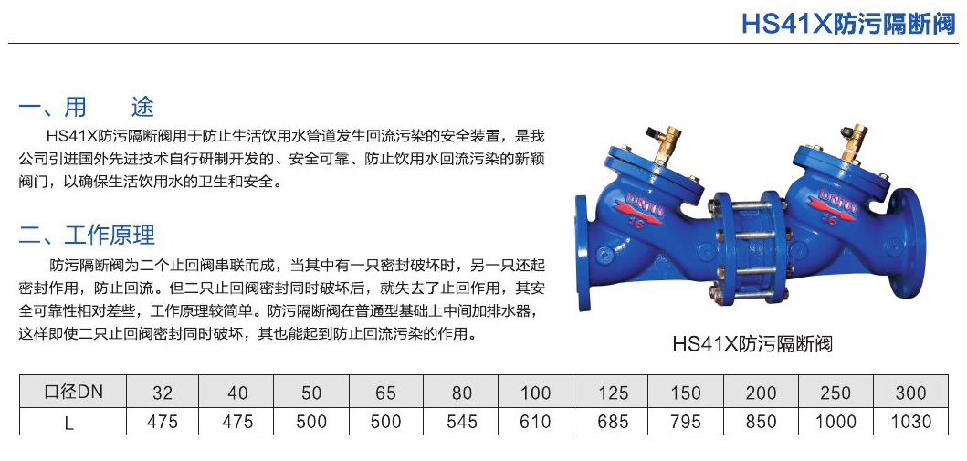 - 用于防止生活飲用水管道發(fā)生回流污染的安全裝置,是我公司引進國外先進技術(shù)自行研制開發(fā)的、安全可靠、防止飲用水加流污染的新穎閥門,以確保生活飲用水的衛(wèi)生和安全。