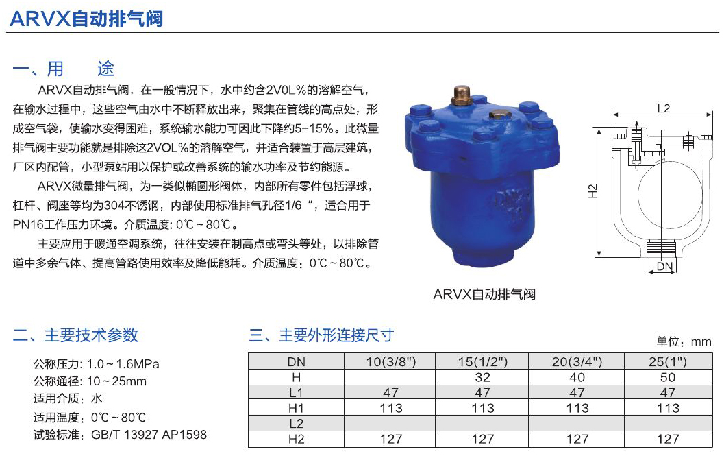 - ARVX自動(dòng)排氣閥,在一般情況下,水中約含2VOL%的溶解空氣,在輸水過程中,這些空氣由水中不斷釋放出來,聚集在管線的高點(diǎn)處,形成空氣袋,使輸水變得困難,系統(tǒng)輸水能力可因此下降約5-15%。
