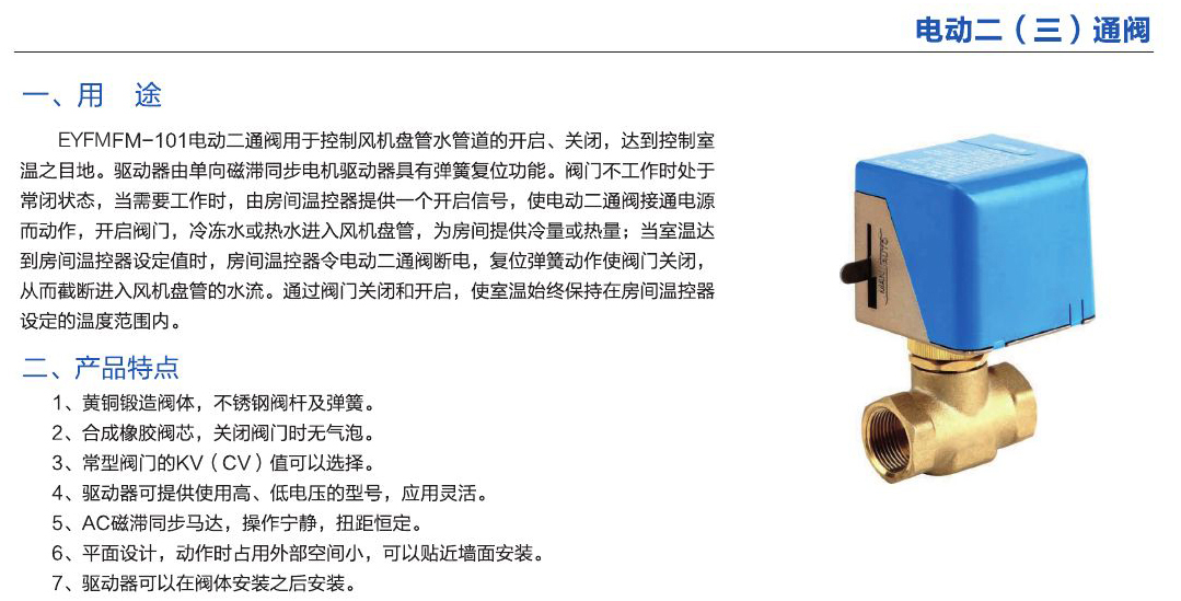 - LGDZFM-101電動二通閥用于控制風(fēng)機(jī)盤管水管道的開啟、關(guān)閉,達(dá)到控制室溫之目地。