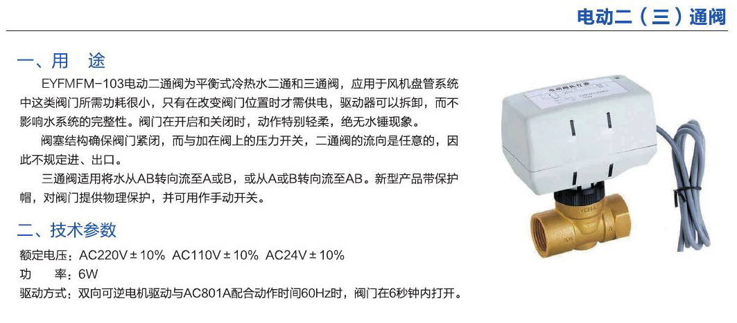 - LGDZFM-103電動二通閥為平衡式冷熱水二通和三通閥,應(yīng)用于風(fēng)機盤管系統(tǒng)中這類閥門所需功耗很小,只有在改變閥門位置時才需供電,驅(qū)動器可以拆卸,而不影響水系統(tǒng)的完整性