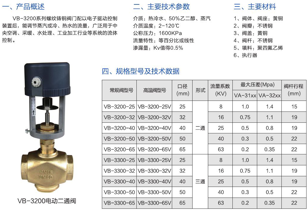 - VB-3200系列螺紋鑄銅閥門配以電子驅(qū)動控制裝置后,能調(diào)節(jié)蒸汽或冷、熱水的流量,廣泛用于中央空調(diào)、采暖、水處理、工業(yè)加工行業(yè)等系統(tǒng)的流體控制。