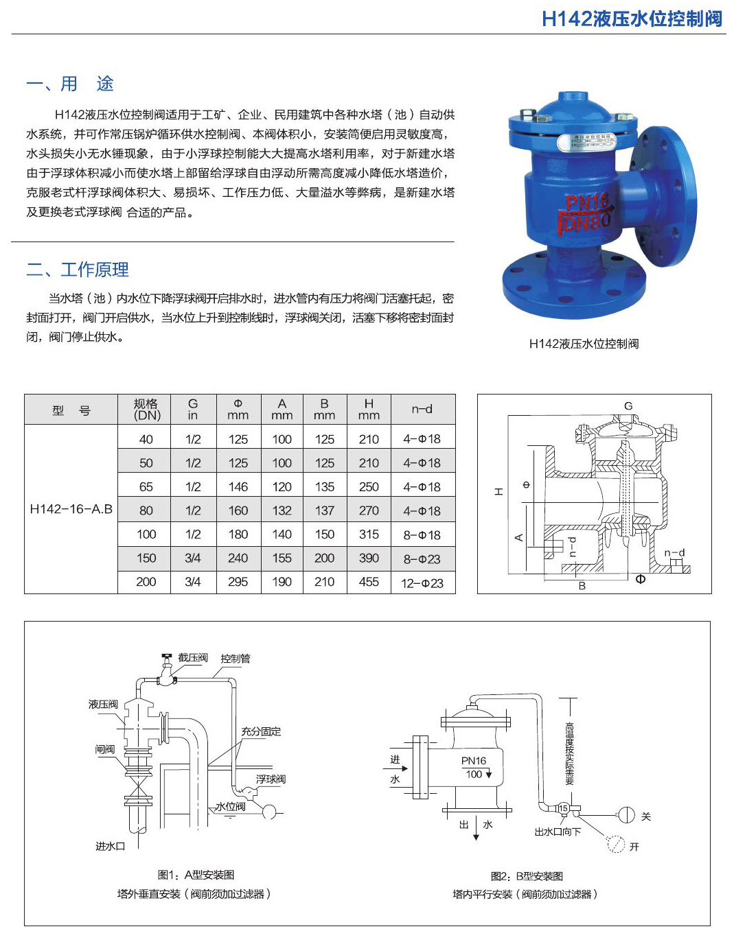 - H142液壓水位控制閥適用于工礦、企業(yè)、民用建筑中各種水塔(池)自動(dòng)供水系統(tǒng),并可作常壓鍋爐循環(huán)供水控制區(qū)閥、體閥體積小,安裝簡(jiǎn)便啟用靈敏度高,水頭損失小無(wú)水錘現(xiàn)象。