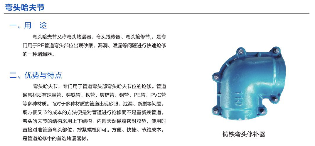 - 彎頭哈夫節(jié)又稱彎頭堵漏器、彎頭搶修器、彎頭搶修節(jié),是專門用于PE管道彎頭部位出現(xiàn)砂眼、漏洞、泄漏洞等問(wèn)題進(jìn)行快速搶修的一種堵漏器。